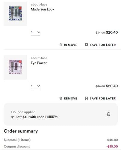 Add. To. Cart! Take 40% OFF budget friendly about-face by Halsey at Ulta Beauty! Even better, use one of the codes below to save $10 OFF your $40 order or $20 OFF your $100 order! Take a look at our example cart below! At these low prices, you can’t afford not to shop this about-face sale!