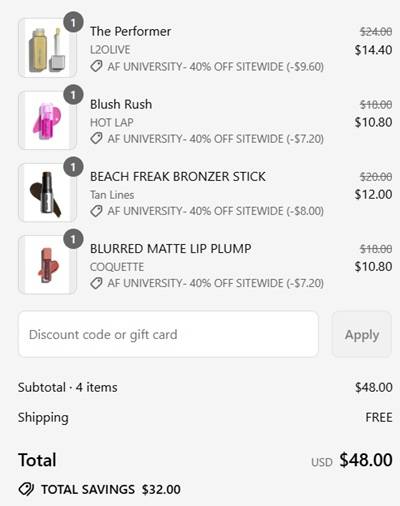 Refresh your makeup bag with big savings! Take 40% OFF your about-face favorites during the Labor Day Sale Event! Pick up the viral Beach Freak Bronzer Stick for that summer glow all year long or score the newest Blush Rush Liquid Blush shade! Bestie Amy loves the The Performer Skin-Focused Foundation for her dry prone skin!