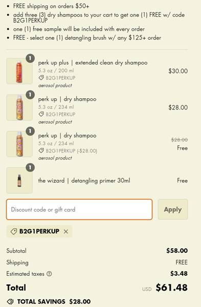 Add 3 eligible items to cart and use the amika dry shampoo coupon code B2G1PERKUP (click to copy) for the lowest priced one to become FREE. FREE SHIPPING applies to orders $50+. Take a look at our other favorite finds!