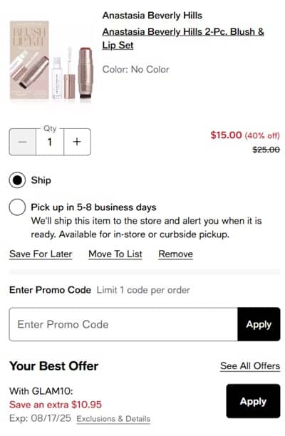 FREE SHIPPING always gets us! Score the Anastasia Beverly Hills Blush & Lip Set, a $45 value if purchased separately, for only $15 at Macy’s! This duo includes a FULL SIZE Cream Stick Blush with Brush Applicator in the shade Soft Rose plus a Crystal Lip Gloss mini! Don’t miss out on the FREE 14 Piece Gift with any $75 10 Days of Glam purchase too!