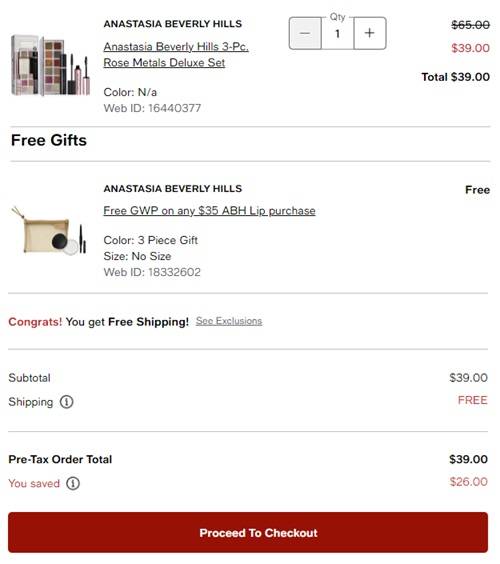 Level up your beauty game with big savings and a freebie! Take 40% OFF select Anastasia Beverly Hills favorites at Macy’s! Don’t sleep on the Rose Metals Deluxe Set! A $103 value if purchased separately, this set includes a FULL SIZE Rose Metals Palette, FULL SIZE Lash Sculpt Mascara, and a FULL SIZE Clear Brow Gel for only $39! Check out our example cart below, you’ll also receive a FREE 3 Piece Gift with select $35 brand purchases! PLUS be sure to check out today’s 50% OFF 10 Days of Glam offers!