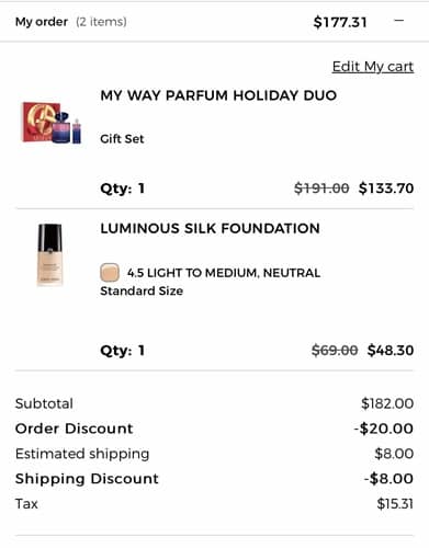 Sign in to your account and use the Armani Beauty Black Friday coupon code BF30 (click to copy) to add the 30% OFF discount to your cart. Then use the coupon code THANKYOU20 (click to copy) to stack an additional $20 OFF your $100 purchase.