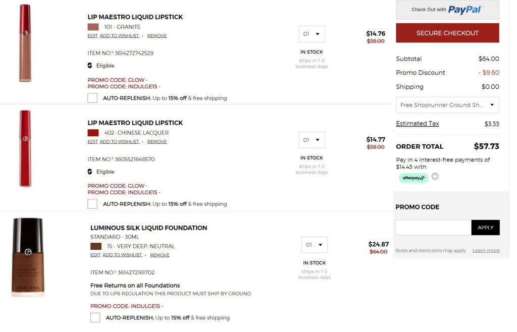 Stop the presses! Purchase the Armani Luminous Silk or Power Fabric Foundation and get TWO Lip Maestro Lipsticks of your choice for FREE PLUS use code INDULGE15 to save an ADDITIONAL 15% OFF! FREE SHIPPING applies on orders $75+ or choose FREE SHIPPING with ShopRunner. If you don’t have a ShopRunner account you can sign up for a FREE 2 year membership from Paypal and get FREE 2-DAY SHIPPING at some of your favorite stores!