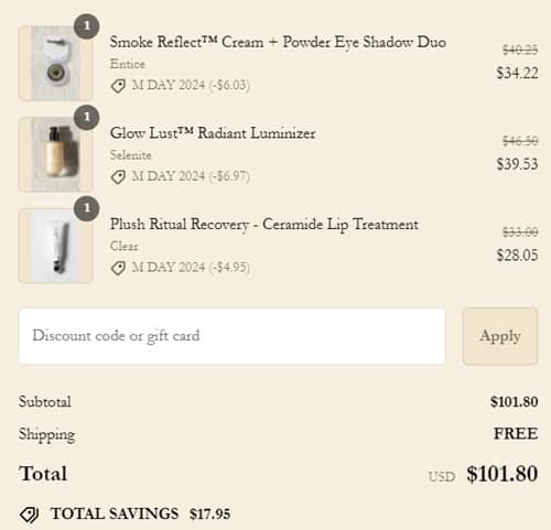 No code needed, the discounted price will reflect in your AURIC Cosmetics cart. FREE SHIPPING applies to orders $100+, otherwise shipping starts at $7.99. Excludes bundles. Take a look at our other favorite deals!