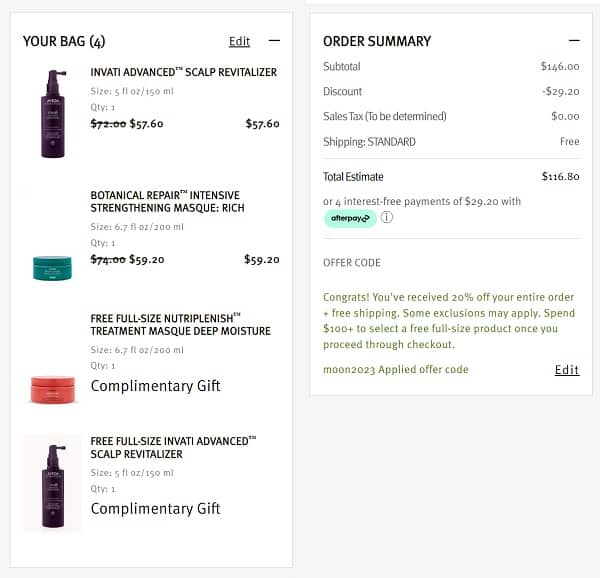 Items are discounted in cart. Use the Aveda coupon code MOON2023 to add the FREE Invati Scalp Revitalizer to your qualifying order. You will be prompted to choose your FREE Hair Mask at checkout once your order qualifies. FREE SHIPPING applies to all orders automatically. Exclusions apply.*