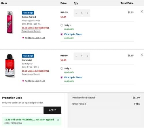 Use the Bath & Body Works coupon code FRESH4FALL (click to copy) to apply discount at checkout or choose FREE buy online, pick up in store if available in your area. Take a look at our other favorite finds!