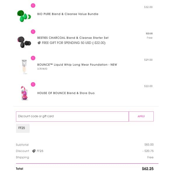 Use the beautyblender coupon code FF25 (click to copy) to add the discount to your cart. The FREE gift with purchase will add to cart automatically once your order qualifies. FREE SHIPPING applies to all orders automatically at checkout. Take a peek at our other favorite deals!