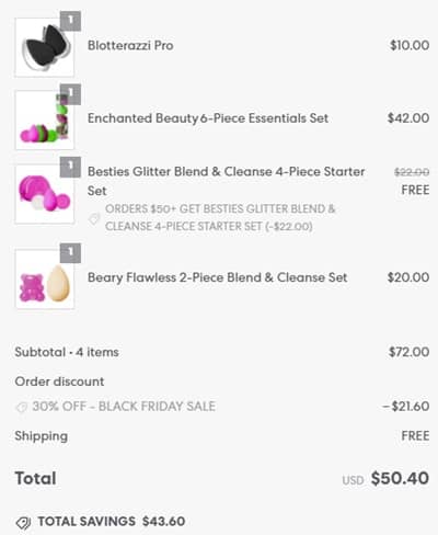 Buy more, save more? Stock up time! Enjoy 25% OFF sitewide or step up to a $35 order and save 30% OFF during the beautyblender Black Friday Sale Event! It gets better! You’ll receive a FREE Glitter Besties Blend & Cleanse 4 Piece Set, a $22 value, with any $50 purchase but only WHILE SUPPLIES LAST! Pull out that gift list and start checking off names! The newest Limited Edition Kits are included!