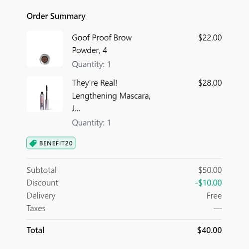 Use the Benefit Cosmetics coupon code BENEFIT20 to add the discount to your cart! FREE SHIPPING applies automatically at checkout. Exclusions may apply.