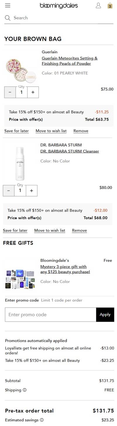 No code needed, eligible Bloomingdale’s beauty items are marked “Take 15% off $150+: Discount applied in bag”. The discount will reflect in cart once your order qualifies. The FREE gift with purchase will add once your order qualifies. FREE SHIPPING applies to most orders for Loyallist members (free to join) or beauty orders $50+ for non members. Exclusions may apply. Take a look at our other favorite finds!