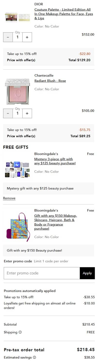 No code needed, eligible Bloomingdale’s beauty items are marked “Take UP TO 15% off”. The discount will reflect in cart once your order qualifies. The FREE gifts with purchase will add once your order qualifies. FREE SHIPPING applies to most orders for Loyallist members (free to join) or beauty orders $50+ for non members. Exclusions may apply. Take a look at our other favorite finds!