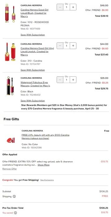 - FREE 2 Piece Beauty Gift with any $100 Carolina Herrera makeup purchase