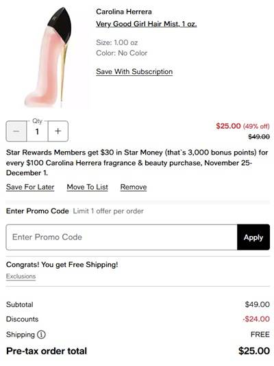 Savings never smelled so good! Add the Carolina Herrera Very Good Girl Hair Mist to your collection for only $25! At this price grab one for yourself and 1 for your Bestie! Leaving your hair nourished and glossy with notes of redcurrant, lychee, rose, vetiver, and vanilla! Our gourmand floral Besties will love this one for every day! PLUS Star Rewards Members (free to join) earn $30 in Star Money (that`s 3,000 bonus points) for every $100 Carolina Herrera fragrance & beauty purchase!