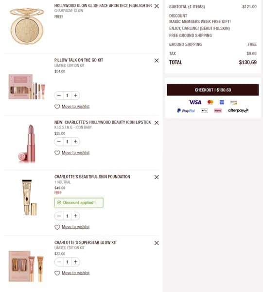 Pull out that red carpet wish list Besties! Sign in to your Loyalty account (free to join) and receive a FREE FULL SIZE Charlotte Tilbury Beautiful Skin Liquid Foundation with any $100 purchase! PLUS orders $110+ also receive a FREE FULL SIZE Hollywood Glow Glide Face Architect Highlighter in Champagne Glow, a $48 value!