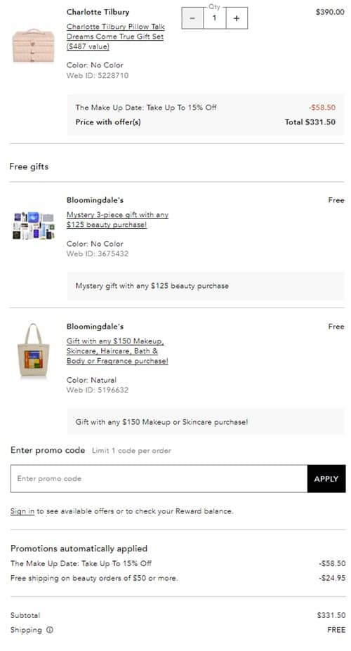 Treat yourself to the gift of glam! Save 15% OFF the Charlotte Tilbury Pillow Talk Dreams Come True Set with FREE SHIPPING at Bloomingdale’s! With a value of $482, this set includes 13 FULL SIZE items and retails for $390. Better yet you’ll receive a FREE 3 Piece Mystery Gift with any $125 beauty or fragrance purchase or step up to a $150 order and get a FREE Bloomingdale’s Canvas Tote Bag! Take a look at our value breakdown below to help you decide if the Charlotte Tilbury Pillow Talk Dreams Come True Set is worth adding to cart!