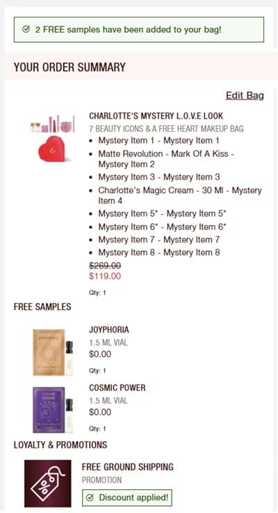 No code needed, Charlotte’s Mystery Set is priced as marked. The FREE gift with purchase will add once your order qualifies. Don’t forget to add your FREE samples. Sign in to your account (free to join) for FREE SHIPPING. Take a look at our other favorite finds!