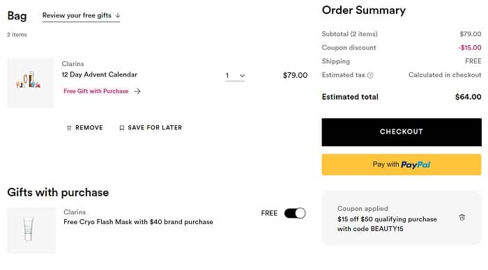 Score a great deal on the Clarins 2023 12 Day Advent Calendar for a LIMITED TIME ONLY! With a value of $210, this set contains 12 items and retails for $79 but you can use the coupon code below to save $15 OFF PLUS get FREE SHIPPING at Ulta Beauty! You’ll also receive a FREE Cryo Flash Mask mini with any $40 Clarins purchase! The FREE 13 Piece Bag with any $80 purchase (2 options) is still available if your order qualifies!