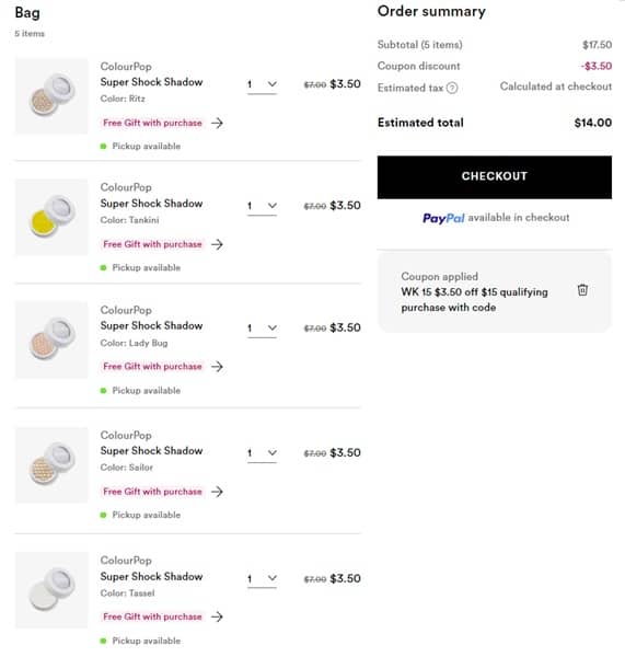 Shake up that makeup routine with something new! Take 50% OFF ColourPop Super Shock Shadows for a LIMITED TIME ONLY at Ulta Beauty! PLUS use the code below to save an additional $3.50 OFF your $15+ qualifying purchase! At this price, don’t hold back! Take a look at our example cart below! Add on your FREE Drawstring Bag with any $30 makeup purchase if your order qualifies!