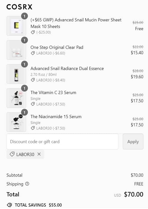 Use the COSRX coupon code LABOR30 (click to copy) to add the discount to cart. The FREE gift with purchase will add to cart once your order qualifies. FREE SHIPPING applies to orders $50+. Take a look at our other favorite finds!