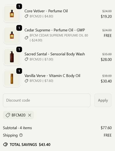 CYKLAR has got you covered from head to toe! Take 20% OFF your body and skincare faves during the CYKLAR Black Friday Sale Event for a LIMITED TIME ONLY! PLUS you’ll receive a FREE FULL SIZE Cedar Supreme Perfume Oil, a $24 value, with any $80 purchase! From deodorant to body cream, oils to wash and everything in between! Treat yourself to decadent self care! You deserve it!