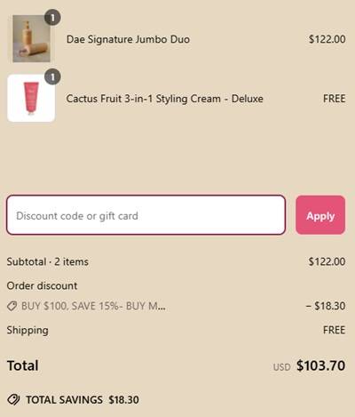 Add all of your favorites to cart because the more you buy, the more you’ll save! Take UP TO 20% OFF your dae Hair essentials for a LIMITED TIME ONLY! From the yummy Prickly Pear Hair Oil to the lightweight, ultra hydrating Signature Collection! Discover your new hair care must haves today!