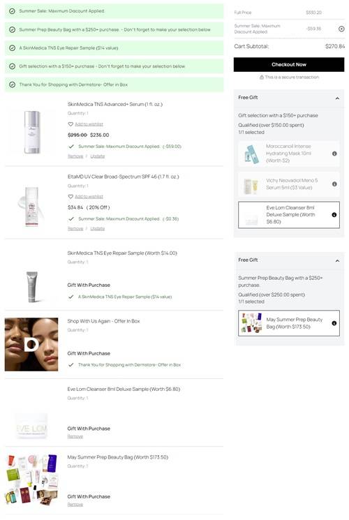 Your cart is calling you Besties! Save UP TO 20% OFF select Dermstore beauty favorites for a LIMITED TIME ONLY! Choose makeup, skincare, hair care, and fragrance from brands like Sunday Riley, SkinMedica, Dr. Dennis Gross, jane iredale, and so many more! It gets better! Receive a FREE 15 Piece Summer Prep Beauty Bag, a $173 value, with any $250 purchase WHILE SUPPLIES LAST! Add. To Cart! Receive your choice of FREE deluxe sample with any $150 purchase!