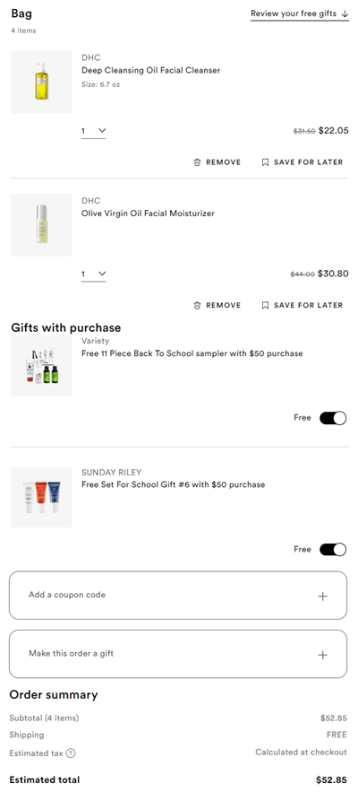 - FREE GIFT on orders $50+ (6 options)