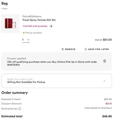 No code needed, eligible Dolce & Gabbana Fragrance Sets are priced as marked. Use the Ulta Beauty coupon code WINTER10 (click to copy) to save 10% OFF your BOPIS buy online pick up in store order if available in your area. FREE SHIPPING applies to orders $25+ for Diamond members and $35+ for everyone else. Check out our other favorite Ulta Beauty finds!