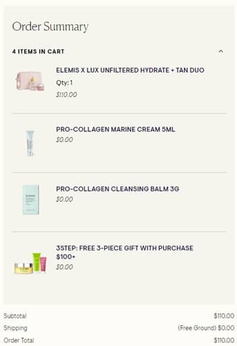 Here’s your sign to shop Besties! Receive a FREE ELEMIS 3 Piece Gift, a $100 value, with any $100 purchase for a LIMITED TIME ONLY! This gift with purchase includes a huge 100g Pro-Collagen Cleansing Balm, a $69 value alone, plus a travel sized Superfood Midnight Facial and Superfood Facial Wash! Check out our example cart below!