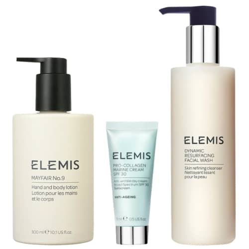 Cleanse and moisturize all over with this gift! For a LIMITED TIME ONLY receive a FREE ELEMIS Face To Body Trio with any full size item purchase! This set includes a FULL SIZE Mayfair No.9 Hand & Body Lotion, FULL SIZE Dynamic Resurfacing Facial Wash and a mini Pro-Collagen Marine Cream SPF 30! That’s a total value of $146!