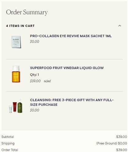 Tackle your dry summer skin courtesy of ELEMIS! Receive a FREE 3 Piece Hydration Gift, a $106 value, with any full size item purchase WHILE SUPPLIES LAST! This gift with purchase includes a FULL SIZE Superfood Facial Wash, travel sized Pro-Collagen Marine Cream SPF 30 ($52 value alone), and a travel sized Frangipani Monoi Body Cream! Check out our example cart below!