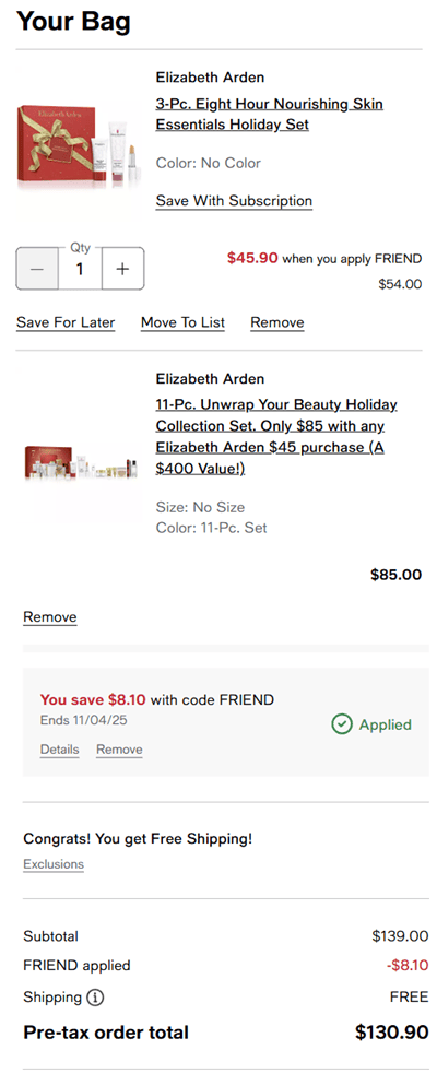 Perfect for the beauty lover in your life or keep it all to yourself! The Elizabeth Arden Unwrap Your Beauty Holiday Collection is here for only $85 with any $45 brand purchase at Macy’s! Valued at $390 and filled with 7 FULL size bestsellers like the Advanced Ceramide Lift and Firm Day Cream, Advanced Ceramide Daily Youth Restoring Capsules, the Eight Hour Cream Intensive Moisturizing Hand Treatment, and more! From makeup to skincare to fragrance! Add yours to cart today!