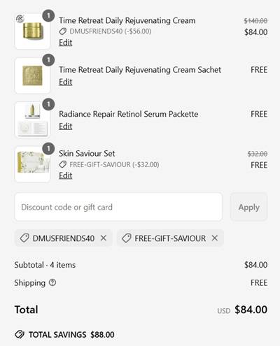 Discover your new luxury favorites for less! Save 40% OFF your Eve Lom essentials! To make the deal even sweeter, you’ll receive a FREE Skin Saviour Duo, a $32 value, with any $130 purchase WHILE SUPPLIES LAST! This offer even includes the newest additions to the Time Retreat Collection! Tackle fine lines and wrinkles for a smoother, softer complexion! Take a look at our example cart below!