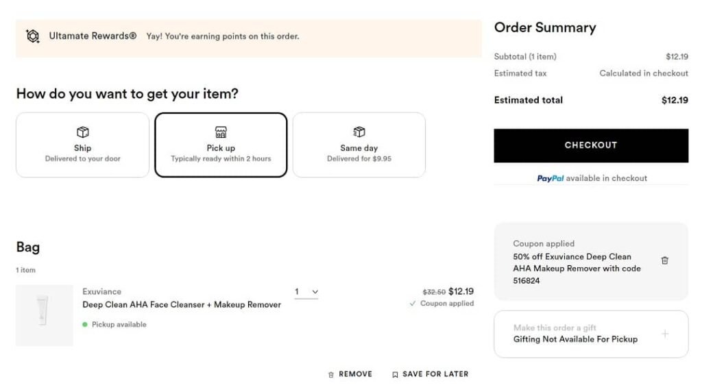 Run, don’t walk! You don’t want to miss today’s Dash to Beauty offer! Save 62% OFF the Exuviance Deep Clean AHA Face Cleanser + Makeup Remover at Ulta Beauty! Regularly $32.50, you’ll find the FULL SIZE foaming gel cleanser on sale for only $24.37 PLUS use the code below to take an additional HALF OFF! Grab one for yourself and also one for your Bestie! We chose the in store pick up option for instant gratification and to avoid shipping costs!