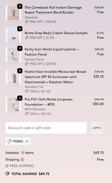 *Excludes: Sale, New Arrivals, Holiday Sets, CLF products and donations, Exclusive Drop Box, Fenty Icon The Case Refillable Lipstick: 5th Anniversary Edition, and Lip Pencil Sharpener.