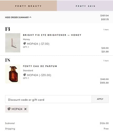 Use the FENTY Beauty coupon code MOP424 (click to copy) to add the discount to cart. FREE SHIPPING applies automatically at checkout. Excludes Cookies N Clean Whipped Clay Intensive Pore + Blackhead Face Scrub and Volcanic Sand + Charcoal. Other exclusions may apply. Take a look at our other favorite finds!