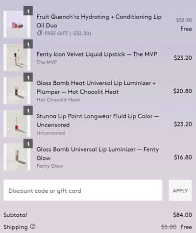 No code needed, eligible FENTY Beauty lippies are priced as marked. You will be prompted to add the FREE gift with purchase once your order qualifies. Sign in to your account (free to join) for FREE SHIPPING. Take a look at our other favorite finds!