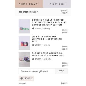 It’s an add to cart kind of day Besties! For a LIMITED TIME ONLY take UP TO 25% OFF your FENTY Beauty and Skin purchase! We love that this offer even includes the NEW Holiday Sets! Maybe the VIRAL Blemish Defeat’r BHA Spot-Targeting Gel has been on your wish list, or a new shade of Gloss Bomb? Here’s your chance to treat yourself for less! What’s in your cart?