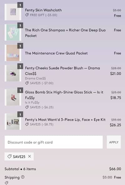 Use the FENTY Beauty coupon code SAVE15 (click to copy) or SAVE25 (click to copy) to add the discount to cart. You will be prompted to add your FREE gift once your order qualifies. Don’t forget to add your FREE samples to orders $65+. Sign in to your account (free to join) for FREE SHIPPING. Exclusions apply.* Take a look at our other favorite finds!