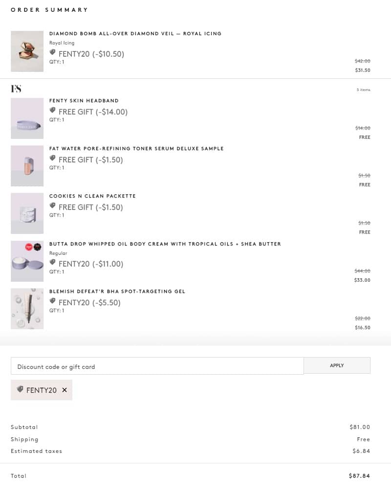 Get your glam on with a beauty haul Besties! For a LIMITED TIME ONLY take 20% OFF your FENTY Beauty and Skin purchase PLUS you’ll receive a FREE 3 Piece Gift with orders $75+! Whether you’re adding the VIRAL FENTY Blemish Defeat’r BHA Spot-Targeting Gel to your skincare routine or picking up a new shade of Gloss Bomb, this sale has something for you! What’s in your cart?