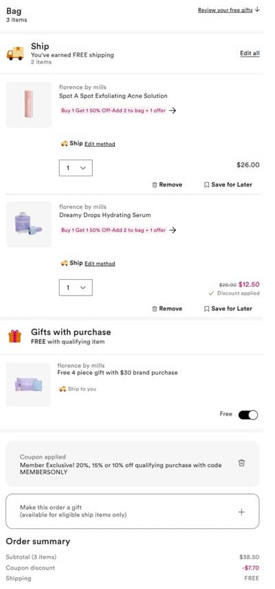 Activate any points multipliers you may have available to you. Add 2 Florence by Mills items to cart for 1 to become 50% OFF. Use the Ulta Beauty coupon code MEMBERSONLY (click to copy) to include the additional Beauty Rewards discount. Use as many times as you like! FREE SHIPPING applies on orders $25+ for Diamond members and $35+ for everyone else OR choose FREE BOPIS buy online pick up in store if available in your area. Check out our other favorite Ulta Beauty finds!