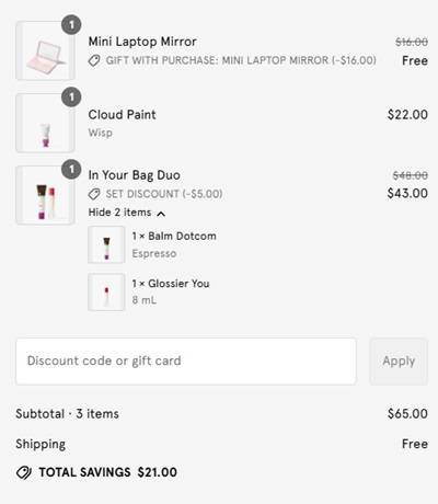This freebie is perfect for on the go! Receive a FREE Glossier Mini Laptop Mirror with any $65 purchase for a LIMITED TIME ONLY! Add the newest Balm Dotcom, Espresso, a rich roasted coffee with a dark mocha tint to your bag or check out the iconic Boy Brow pomade and get this freebie WHILE SUPPLIES LAST!