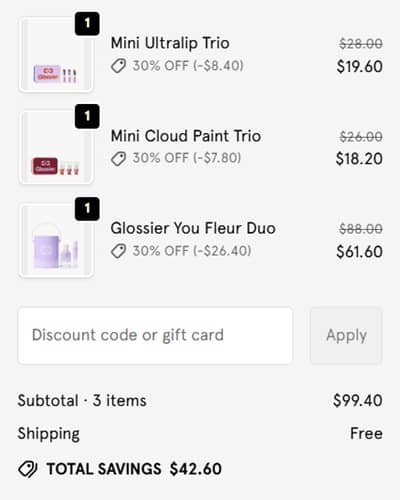 The more you buy, the more you’ll save Besties! Sign in to your rewards account (free to join) and take 25% OFF your Glossier essentials! Step up to a $100 purchase and you’ll save 30% OFF so add your restock list to cart! This sale even includes select sets to maximize your savings! Add a new shade of the bestselling Cloud Paint Gel Cream Blush or treat yourself to the musky floral notes in You Fleur Eau de Parfum!
