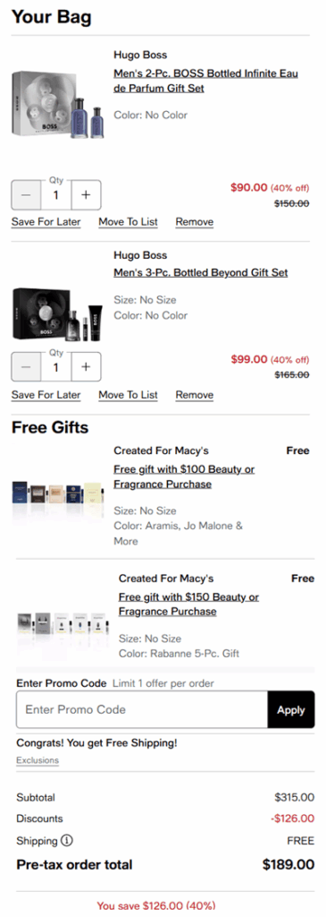 No code needed, eligible Hugo Boss fragrance sets are priced as marked. Macy’s Star Rewards members (free to join) enjoy FREE SHIPPING on orders $39+ or choose FREE in store pick up if available in your area. FREE SHIPPING applies to orders $49+ for non-members. Take a look at our other favorite finds!