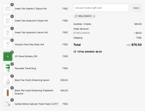 We love a mystery! Receive a FREE 25 Piece innisfree Mystery Gift valued at UP TO $127 with any $65 purchase WHILE SUPPLIES LAST! Step up to an $85 order and you’ll also receive a FREE Reusable Travel Mug! New customers use the coupon code WELCOME10 (click to copy) to save 10% OFF your first purchase! Stock up on your K-Beauty skincare must haves and enjoy a freebie for yourself! Check out our example cart below!