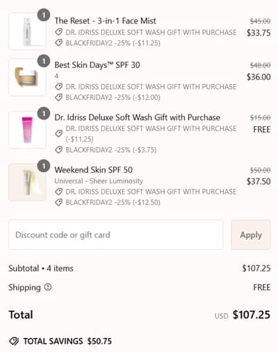Simplify your beauty regimen with skincare infused makeup! Save 25% OFF with FREE SHIPPING during the Iris&Romeo Black Friday Sale Event! To make the deal even sweeter, you’ll receive a FREE travel sized Dr Idriss Soft Wash Complete Daily Cleanser, a $15 value, with any $100 purchase WHILE SUPPLIES LAST! Add a new shade of the soothing Power Peptide Lip Balm to your bag or stock up on the bestselling Weekend Skin SPF 50! Add. To. Cart!