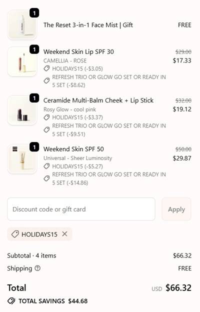 FULL SIZE freebies for the win! Receive a FREE Iris&Romeo The Reset Mist with any $75 purchase! PLUS use the coupon code below to save 15% OFF! Check out the Refresh Trio! This set includes 3 FULL SIZE bestsellers: the Weekend Skin SPF 30 Moisture Lip Balm, SPF 50 Natural Glow Skin Tint, and Ceramide Multi-balm Lip+Cheek Cream Blush Stick! PLUS you’ll receive the FREE The Reset Luminous Serum Spray! That’s a total value of $159 for only $78!