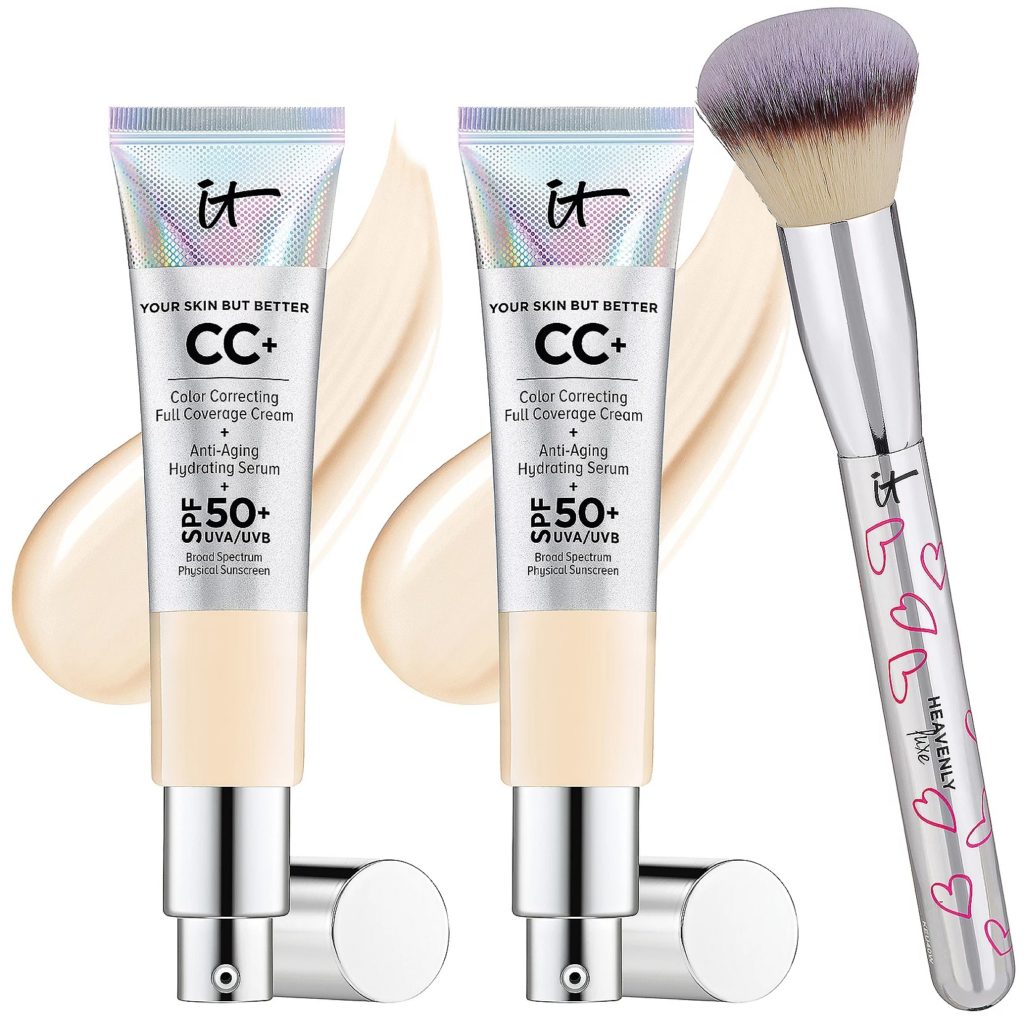 QVC has your base covered with this IT Cosmetics CC Cream Full Coverage SPF50 Duo & Heart Brush set! The set contains 2 FULL SIZED IT Cosmetics Your Skin But Better CC Creams, PLUS the heart-decorated luxe foundation brush for only $49.96! Shipping is only $3.50.