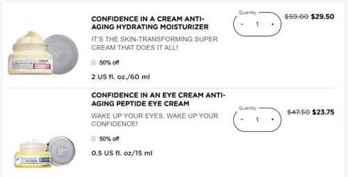 Besties, we’re CONFIDENT you’re going to love this deal! For a LIMITED TIME ONLY save 50% OFF the bestselling IT Cosmetics Confidence in a Cream Hydrating Moisturizer and the Confidence in an Eye Cream! Reward IT members (free to join) save 30% OFF everything else! Non-members only save 25% OFF so be sure to sign in! To make the deal even sweeter, orders $85+ receive a FREE 6 Piece Skincare Gift and purchases $115+ receive an additional 2 FREE items for a total value of $74!