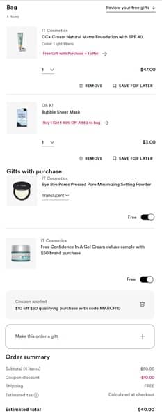 Calling all of our oily and combo skin Besties! Don’t let this freebie pass you by! You’ll receive a FREE FULL SIZE Bye Bye Pores Pressed Pore Minimizing Setting Powder in your choice of shade when you buy a CC+ Cream Natural Matte Foundation at Ulta Beauty! Reduce shine and color correct with this full coverage foundation! PLUS today is the LAST DAY for $10 OFF $50 and $20 OFF $100 purchases (including prestige and fragrance) so be sure to add the code below if your order qualifies! Take a look at our example cart!